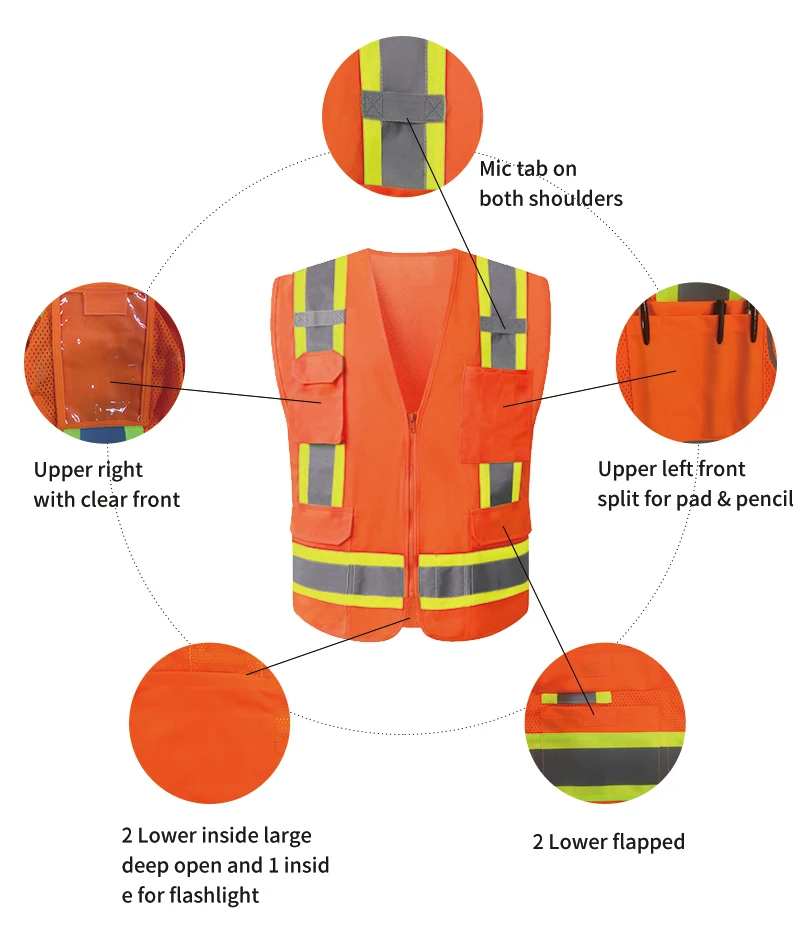Gilet de sécurité haute visibilité Couleur: jaune fluo, orange Utilisation: Sécurité routière Matériel de sécurité au travail: 100% polyester Taille de maille: Personnalisé Caractéristique: Haute visibilité Ruban réfléchissant: Ruban haute visibilité Logo: Spécification personnalisée